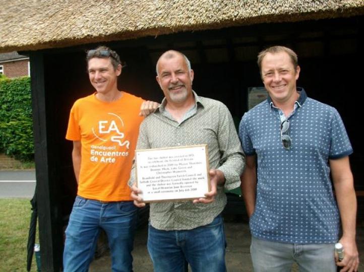 A gathering of residents assembled at Bramfield’s elegantly re-thatched bus shelter for an informal ‘unveiling’ ceremony of a commemorative plaque which reads: